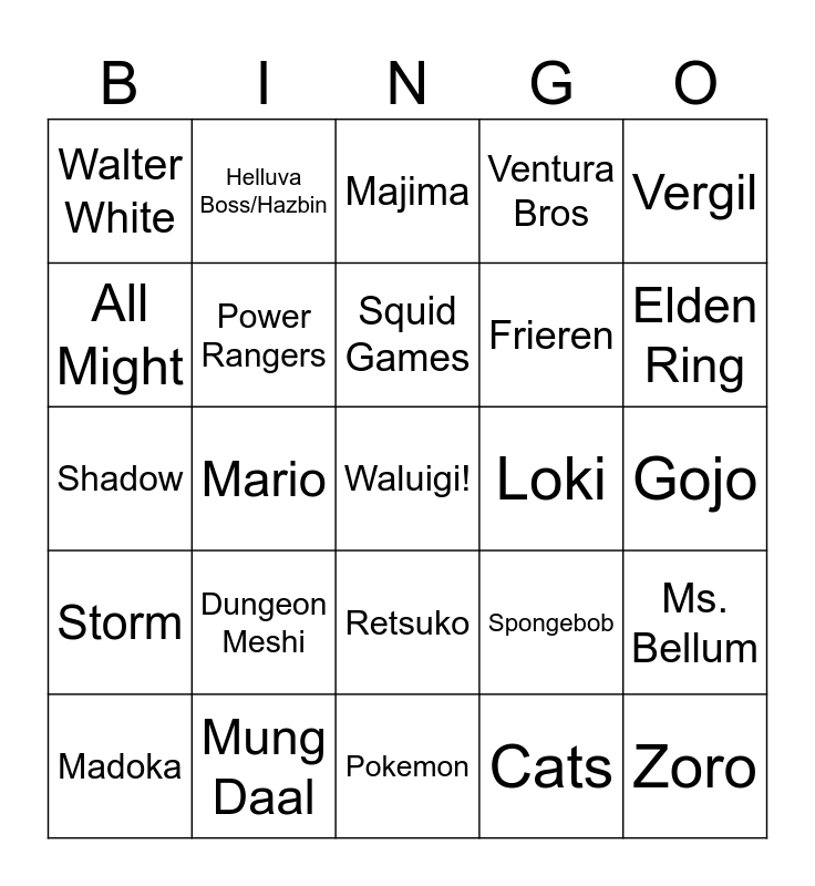 This bingo card has a free space and 24 words: Dungeon Meshi, Mung Daal, Squid Games, Madoka, Vergil, Walter White, All Might, Helluva Boss/Hazbin, Loki, Retsuko, Frieren, Shadow, Spongebob, Ms. Bellum, Power Rangers, Cats, Gojo, Majima, Elden Ring, Mario, Zoro, Storm, Ventura Bros and Pokemon.