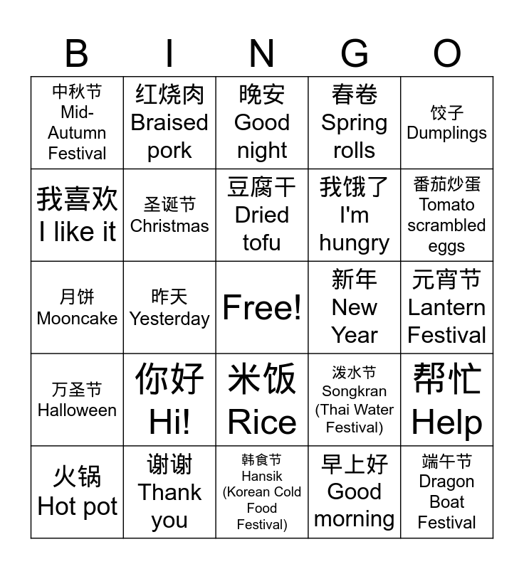 This bingo card has a free space and 24 words: 你好 Hi!, 谢谢 Thank you, 豆腐干 Dried tofu, 火锅 Hot pot, 饺子 Dumplings, 中秋节 Mid-Autumn Festival, 我喜欢 I like it, 红烧肉 Braised pork, 新年 New Year, 米饭 Rice, 我饿了 I'm hungry, 月饼 Mooncake, 泼水节 Songkran (Thai Water Festival), 帮忙 Help, 圣诞节 Christmas, 早上好 Good morning, 元宵节 Lantern Festival, 晚安 Good night, 番茄炒蛋 Tomato scrambled eggs, 昨天 Yesterday, 端午节 Dragon Boat Festival, 万圣节 Halloween, 春卷 Spring rolls and 韩食节 Hansik (Korean Cold Food Festival).