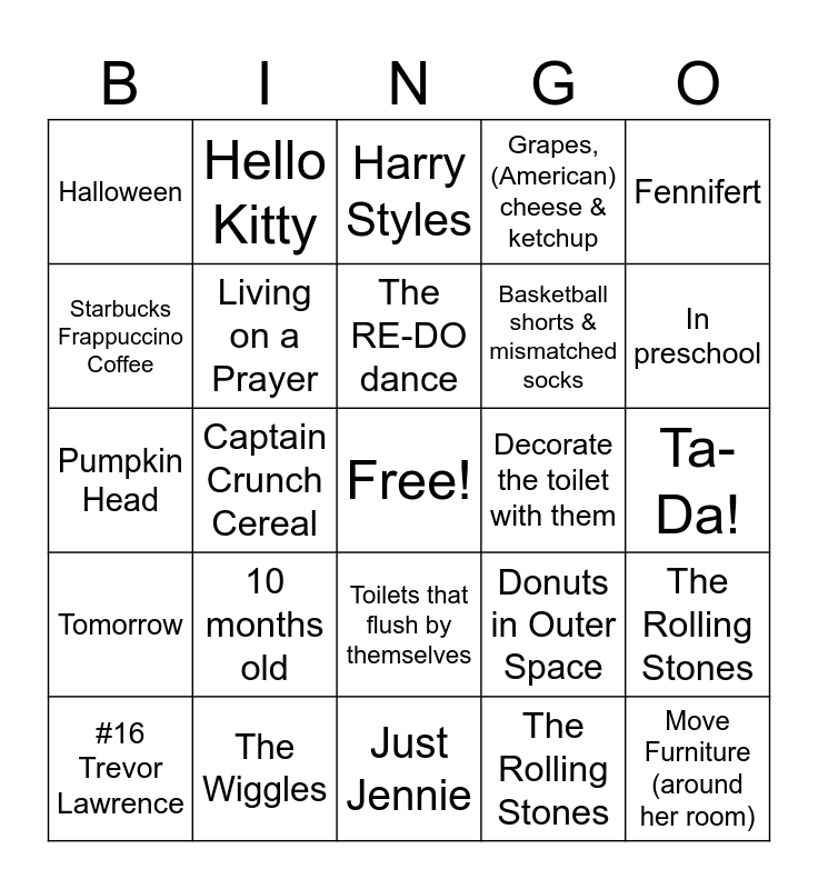 This bingo card has a free space and 34 words: Captain Crunch Cereal, The Rolling Stones, Boys who work at BJs, Sing with the band, Tomorrow, Living on a Prayer, Fennifert, #16 Trevor Lawrence, Hello Kitty, So, do you have any pets?, The RE-DO dance, Harry Styles, Tomatoes, Ketchup, Decorate the toilet with them, In preschool, The Wiggles, Pumpkin Head, 10 months old, Donuts in Outer Space, Toilets that flush by themselves, Make slime, Halloween, Ta-Da!, Just Jennie, Move Furniture (around her room), Grapes, (American) cheese & ketchup, Not taking a sip after saying “Cheers”, Basketball shorts & mismatched socks, Starbucks Frappuccino Coffee, Francine, Captain Crunch Cereal, The Rolling Stones and Boys who work at BJs.