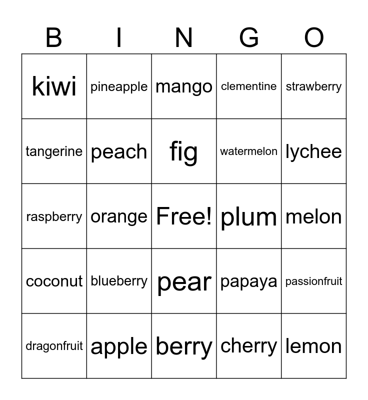 This bingo card has a free space and 30 words: apple, banana, orange, grape, kiwi, mango, peach, pear, plum, berry, melon, lemon, cherry, apricot, lychee, lime, papaya, coconut, blueberry, strawberry, raspberry, blackberry, pineapple, watermelon, tangerine, clementine, passionfruit, dragonfruit, fig and pomegranate.