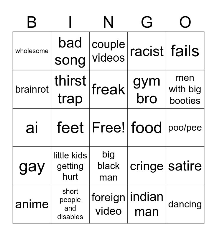 This bingo card has a free space and 24 words: little kids getting hurt, short people and disables, freak, anime, fails, wholesome, brainrot, bad song, food, big black man, gym bro, ai, cringe, satire, thirst trap, indian man, poo/pee, couple videos, men with big booties, feet, dancing, gay, racist and foreign video.