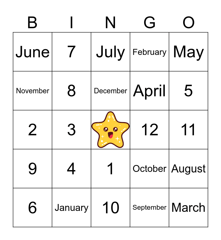 This bingo card has a free space and 24 words: 4, January, December, 6, May, June, November, 7, 12, 1, April, 2, October, August, 8, September, 11, July, 5, 3, March, 9, February and 10.