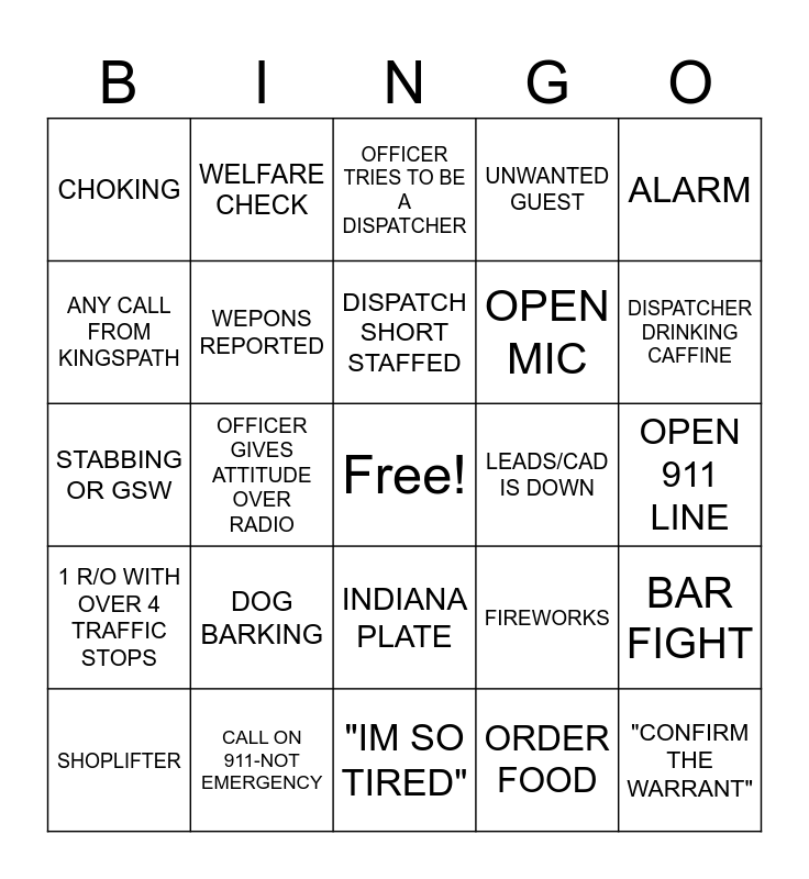 This bingo card has a free space and 24 words: DOG BARKING, CALL ON 911-NOT EMERGENCY, DISPATCH SHORT STAFFED, SHOPLIFTER, ALARM, CHOKING, ANY CALL FROM KINGSPATH, WELFARE CHECK, LEADS/CAD IS DOWN, INDIANA PLATE, OPEN MIC, STABBING OR GSW, FIREWORKS, BAR FIGHT, WEPONS REPORTED, ORDER FOOD, OPEN 911 LINE, OFFICER TRIES TO BE A DISPATCHER, DISPATCHER DRINKING CAFFINE, OFFICER GIVES ATTITUDE OVER RADIO, "CONFIRM THE WARRANT", 1 R/O WITH OVER 4 TRAFFIC STOPS, UNWANTED GUEST and "IM SO TIRED".