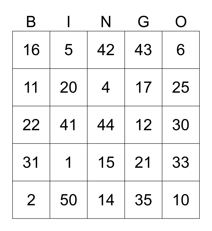 This bingo card has 25 words: 1, 14, 4, 2, 6, 16, 11, 5, 12, 15, 17, 22, 21, 33, 20, 10, 30, 42, 25, 41, 44, 50, 31, 43 and 35.