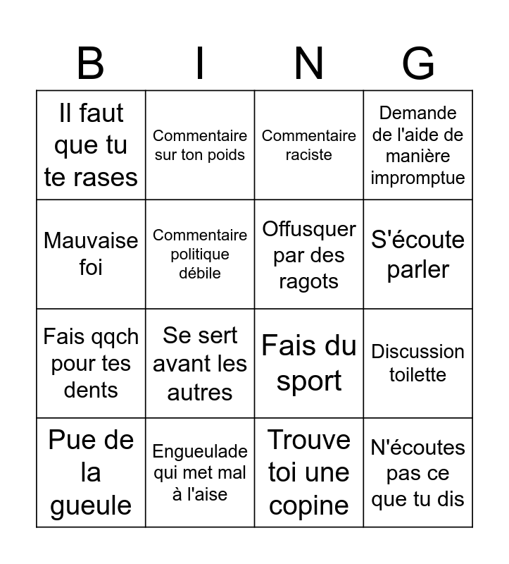 This bingo card has 16 words: Engueulade qui met mal à l'aise, Discussion toilette, Commentaire raciste, Il faut que tu te rases, Fais qqch pour tes dents, Commentaire sur ton poids, Fais du sport, Trouve toi une copine, Mauvaise foi, Commentaire politique débile, Pue de la gueule, Demande de l'aide de manière impromptue, Se sert avant les autres, S'écoute parler, Offusquer par des ragots and N'écoutes pas ce que tu dis.
