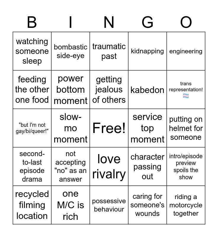 This bingo card has a free space and 24 words: not accepting "no" as an answer, one M/C is rich, getting jealous of others, recycled filming location, engineering, watching someone sleep, feeding the other one food, bombastic side-eye, service top moment, love rivalry, kabedon, "but I'm not gay/bi/queer!", character passing out, intro/episode preview spoils the show, power bottom moment, caring for someone's wounds, putting on helmet for someone, traumatic past, trans representation! 🏳️⚧️, slow-mo moment, riding a motorcycle together, second-to-last episode drama, kidnapping and possessive behaviour.