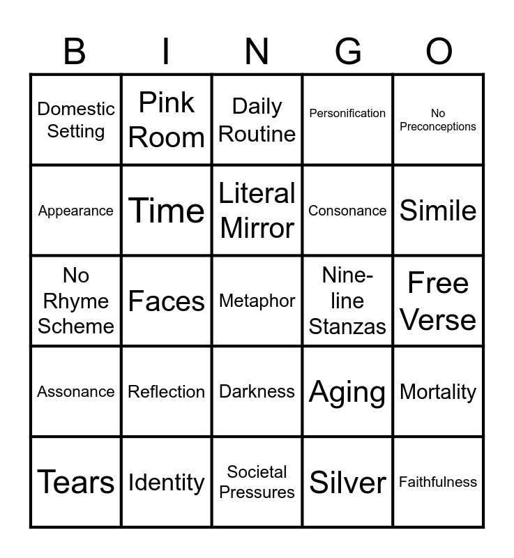 This bingo card has a free space and 24 words: Tears, Reflection, Literal Mirror, Silver, No Preconceptions, Domestic Setting, Pink Room, Daily Routine, Nine-line Stanzas, Free Verse, No Rhyme Scheme, Time, Aging, Mortality, Appearance, Identity, Societal Pressures, Personification, Simile, Assonance, Faces, Darkness, Consonance and Faithfulness.