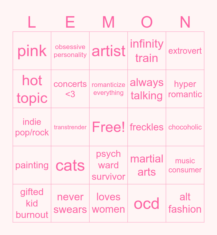 This bingo card has a free space and 31 words: loves women, short, transtrender, svtfoe, pink, artist, concerts <3, martial arts, freckles, ocd, chocoholic, alt fashion, percy jackson, "plays guitar", hyper romantic, bpd, music consumer, cats, painting, psych ward survivor, extrovert, awful time management, gifted kid burnout, obsessive personality, always talking, hot topic, infinity train, indie pop/rock, never swears, romanticize everything and curly hair.