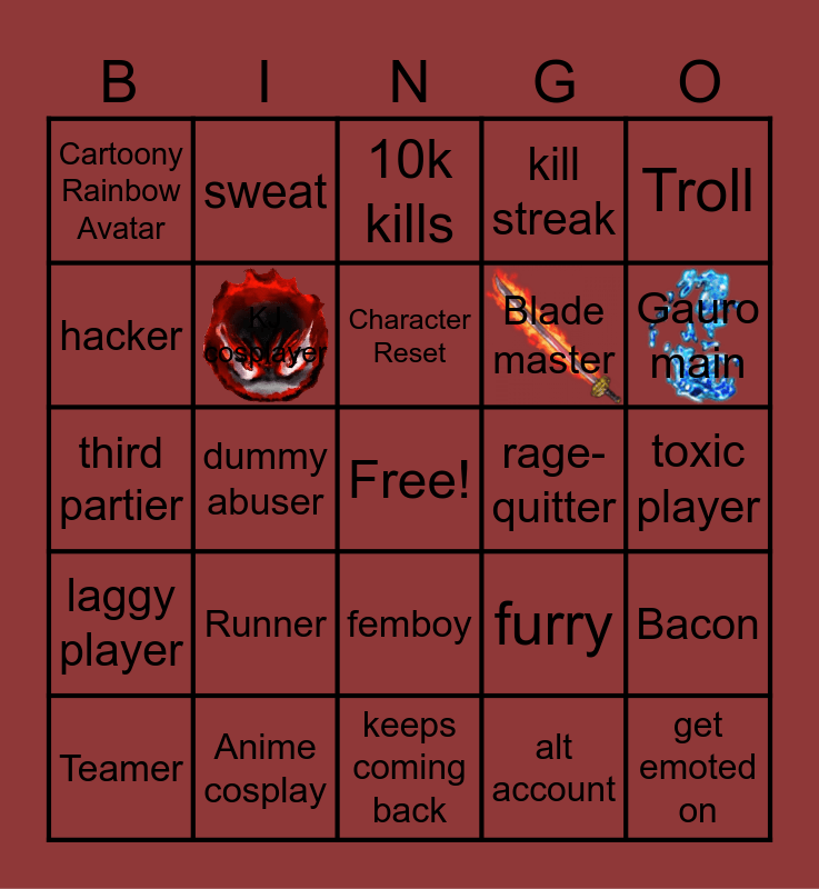 This bingo card has 3 images, a free space and 24 words: Runner, Anime cosplay, Character Reset, Teamer, Troll, Cartoony Rainbow Avatar, hacker, sweat, rage-quitter, femboy, Blade master, third partier, furry, Bacon, KJ cosplayer, alt account, toxic player, 10k kills, Gauro main, dummy abuser, get emoted on, laggy player, kill streak and keeps coming back.