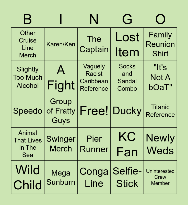 This bingo card has a free space and 24 words: Swinger Merch, Mega Sunburn, Vaguely Racist Caribbean Reference, Wild Child, Family Reunion Shirt, Other Cruise Line Merch, Slightly Too Much Alcohol, Karen/Ken, Ducky, Pier Runner, Socks and Sandal Combo, Speedo, KC Fan, Newly Weds, A Fight, Selfie-Stick, Titanic Reference, The Captain, "It's Not A bOaT", Group of Fratty Guys, Uninterested Crew Member, Animal That Lives In The Sea, Lost Item and Conga Line.