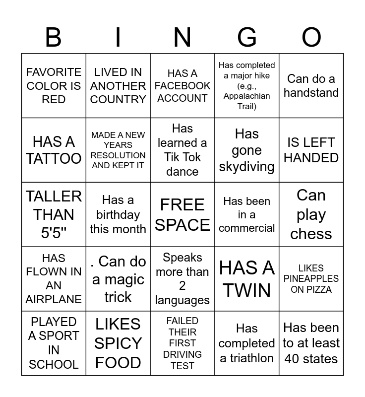 This bingo card has a free space and 24 words: . Can do a magic trick, LIKES SPICY FOOD, Has learned a Tik Tok dance, PLAYED A SPORT IN SCHOOL, Can do a handstand, FAVORITE COLOR IS RED, HAS A TATTOO, LIVED IN ANOTHER COUNTRY, Has been in a commercial, Speaks more than 2 languages, Has gone skydiving, TALLER THAN 5'5'', HAS A TWIN, LIKES PINEAPPLES ON PIZZA, MADE A NEW YEARS RESOLUTION AND KEPT IT, Has completed a triathlon, Can play chess, HAS A FACEBOOK ACCOUNT, IS LEFT HANDED, Has a birthday this month, Has been to at least 40 states, HAS FLOWN IN AN AIRPLANE, Has completed a major hike (e.g., Appalachian Trail) and FAILED THEIR FIRST DRIVING TEST.