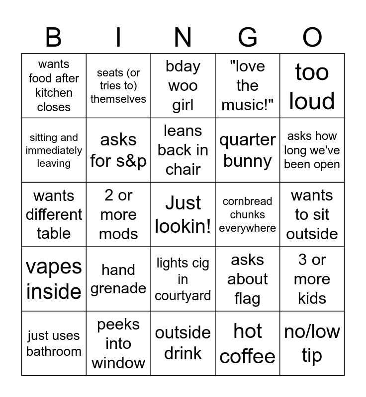 This bingo card has a free space and 24 words: hand grenade, peeks into window, leans back in chair, just uses bathroom, too loud, wants food after kitchen closes, sitting and immediately leaving, seats (or tries to) themselves, cornbread chunks everywhere, lights cig in courtyard, quarter bunny, wants different table, asks about flag, 3 or more kids, asks for s&p, hot coffee, wants to sit outside, bday woo girl, asks how long we've been open, 2 or more mods, no/low tip, vapes inside, "love the music!" and outside drink.