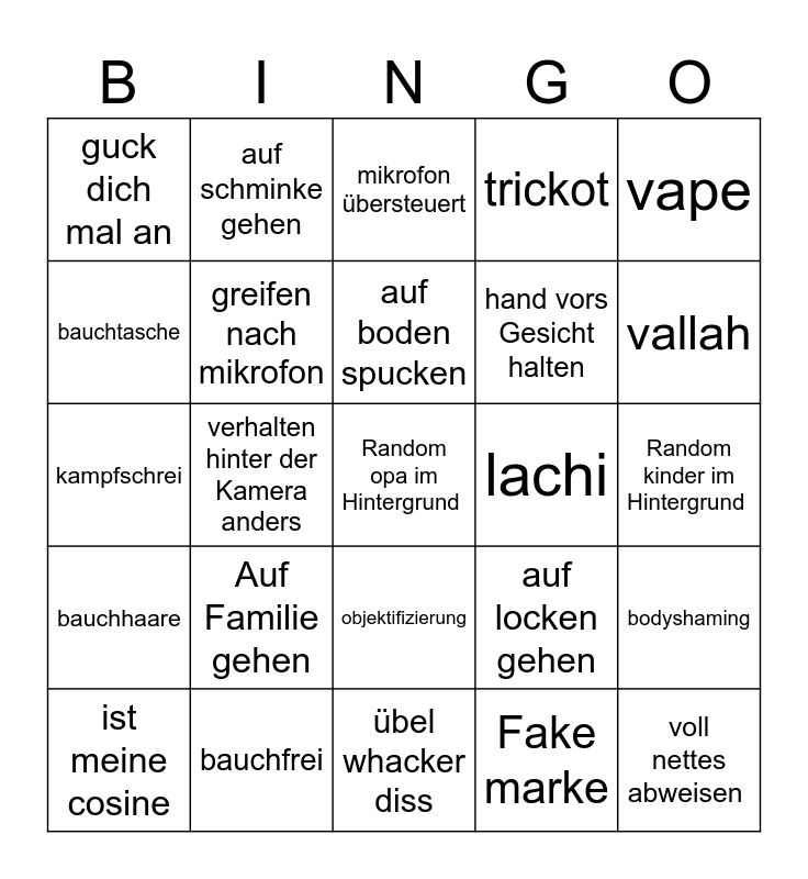 This bingo card has a free space and 24 words: Auf Familie gehen, bauchfrei, auf boden spucken, ist meine cosine, vape, guck dich mal an, bauchtasche, auf schminke gehen, lachi, objektifizierung, hand vors Gesicht halten, kampfschrei, auf locken gehen, bodyshaming, greifen nach mikrofon, Fake marke, Random kinder im Hintergrund, mikrofon übersteuert, vallah, verhalten hinter der Kamera anders, voll nettes abweisen, bauchhaare, trickot and übel whacker diss.