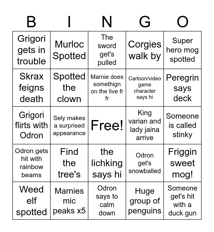 This bingo card has a free space and 24 words: Find the tree's, Marnies mic peaks x5, Marnie does somethign on the live fr fr, Weed elf spotted, Super hero mog spotted, Grigori gets in trouble, Skrax feigns death, Murloc Spotted, King varian and lady jaina arrive, the lichking says hi, Cartoon/video game character says hi, Grigori flirts with Odron, Odron get's snowballed, Friggin sweet mog!, Spotted the clown, Huge group of penguins, Someone is called stinky, The sword get's pulled, Peregrin says deck, Sely makes a surprised appearance, Someone get's hit with a duck gun, Odron gets hit with rainbow beams, Corgies walk by and Odron says to calm down.