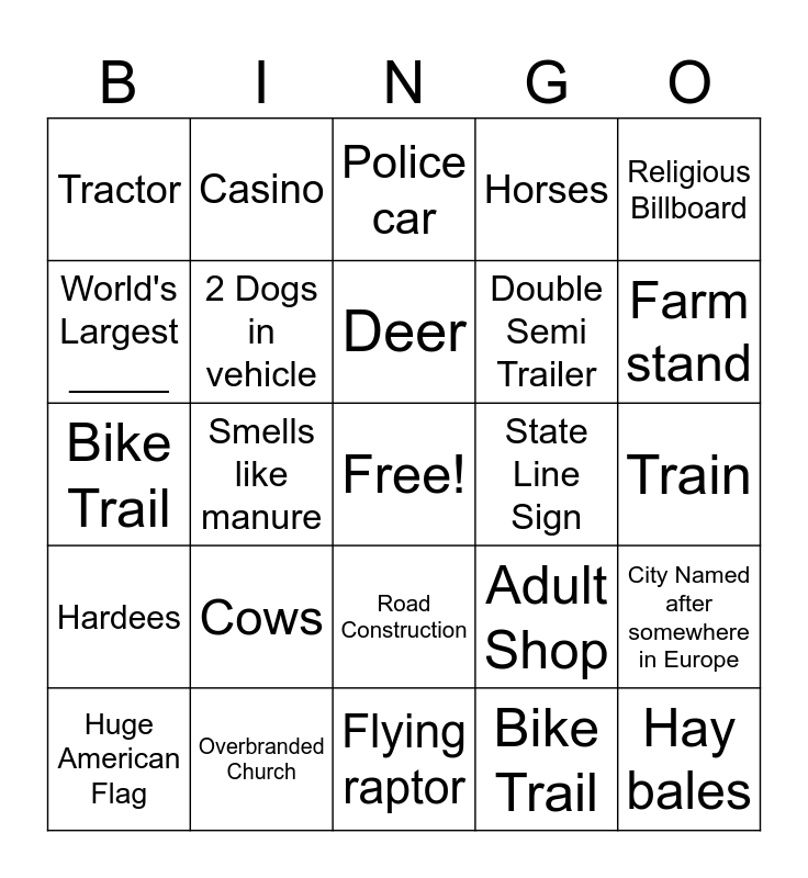 This bingo card has a free space and 24 words: Cows, Overbranded Church, Deer, Huge American Flag, Religious Billboard, Tractor, World's Largest _____, Casino, State Line Sign, Road Construction, Double Semi Trailer, Bike Trail, Adult Shop, City Named after somewhere in Europe, 2 Dogs in vehicle, Bike Trail, Train, Police car, Farm stand, Smells like manure, Hay bales, Hardees, Horses and Flying raptor.