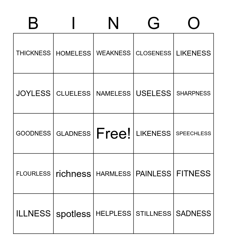 This bingo card has a free space and 24 words: richness, spotless, NAMELESS, ILLNESS, LIKENESS, THICKNESS, JOYLESS, HOMELESS, LIKENESS, HARMLESS, USELESS, GOODNESS, PAINLESS, FITNESS, CLUELESS, STILLNESS, SPEECHLESS, WEAKNESS, SHARPNESS, GLADNESS, SADNESS, FLOURLESS, CLOSENESS and HELPLESS.