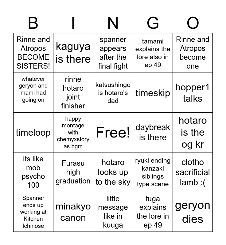 This bingo card has a free space and 24 words: Furasu high graduation, minakyo canon, katsushingo is hotaro's dad, Spanner ends up working at Kitchen Ichinose, Rinne and Atropos become one, Rinne and Atropos BECOME SISTERS!, whatever geryon and mami had going on, kaguya is there, daybreak is there, hotaro looks up to the sky, timeskip, timeloop, ryuki ending kanzaki siblings type scene, clotho sacrificial lamb :(, rinne hotaro joint finisher, fuga explains the lore in ep 49, hotaro is the og kr, spanner appears after the final fight, hopper1 talks, happy montage with chemyxstory as bgm, geryon dies, its like mob psycho 100, tamami explains the lore also in ep 49 and little message like in kuuga.