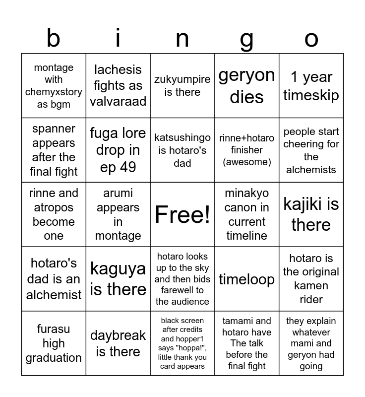 This bingo card has a free space and 24 words: kaguya is there, daybreak is there, katsushingo is hotaro's dad, furasu high graduation, 1 year timeskip, montage with chemyxstory as bgm, spanner appears after the final fight, lachesis fights as valvaraad, minakyo canon in current timeline, hotaro looks up to the sky and then bids farewell to the audience, rinne+hotaro finisher (awesome), rinne and atropos become one, timeloop, hotaro is the original kamen rider, fuga lore drop in ep 49, tamami and hotaro have The talk before the final fight, kajiki is there, zukyumpire is there, people start cheering for the alchemists, arumi appears in montage, they explain whatever mami and geryon had going, hotaro's dad is an alchemist, geryon dies and black screen after credits and hopper1 says "hoppa!", little thank you card appears.