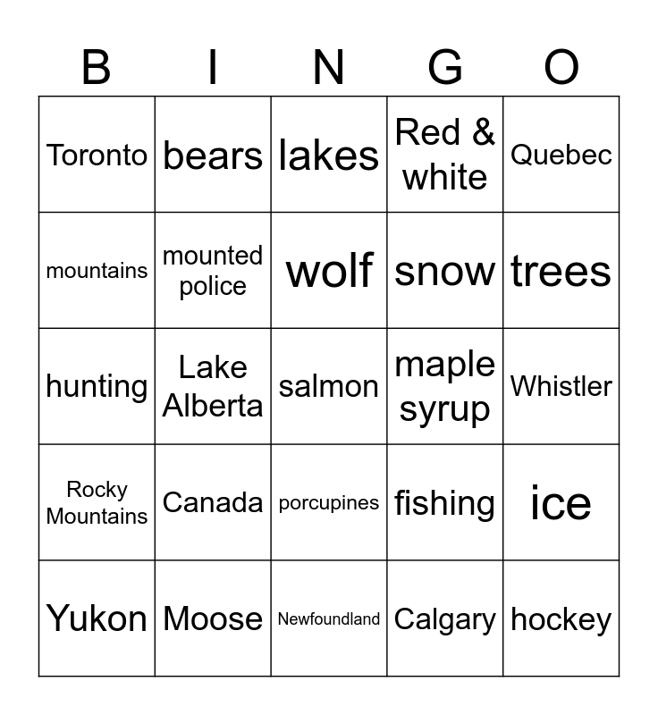 This bingo card has a free space and 24 words: Canada, Moose, wolf, Yukon, Quebec, Toronto, mountains, bears, maple syrup, porcupines, snow, hunting, fishing, ice, mounted police, Calgary, Whistler, lakes, trees, Lake Alberta, hockey, Rocky Mountains, Red & white and Newfoundland.