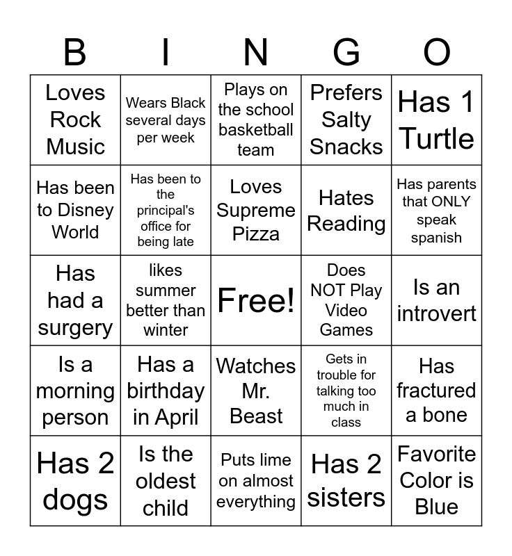 This bingo card has a free space and 24 words: Has a birthday in April, Is the oldest child, Loves Supreme Pizza, Has 2 dogs, Has 1 Turtle, Loves Rock Music, Has been to Disney World, Wears Black several days per week, Does NOT Play Video Games, Watches Mr. Beast, Hates Reading, Has had a surgery, Gets in trouble for talking too much in class, Has fractured a bone, Has been to the principal's office for being late, Has 2 sisters, Is an introvert, Plays on the school basketball team, Has parents that ONLY speak spanish, likes summer better than winter, Favorite Color is Blue, Is a morning person, Prefers Salty Snacks and Puts lime on almost everything.