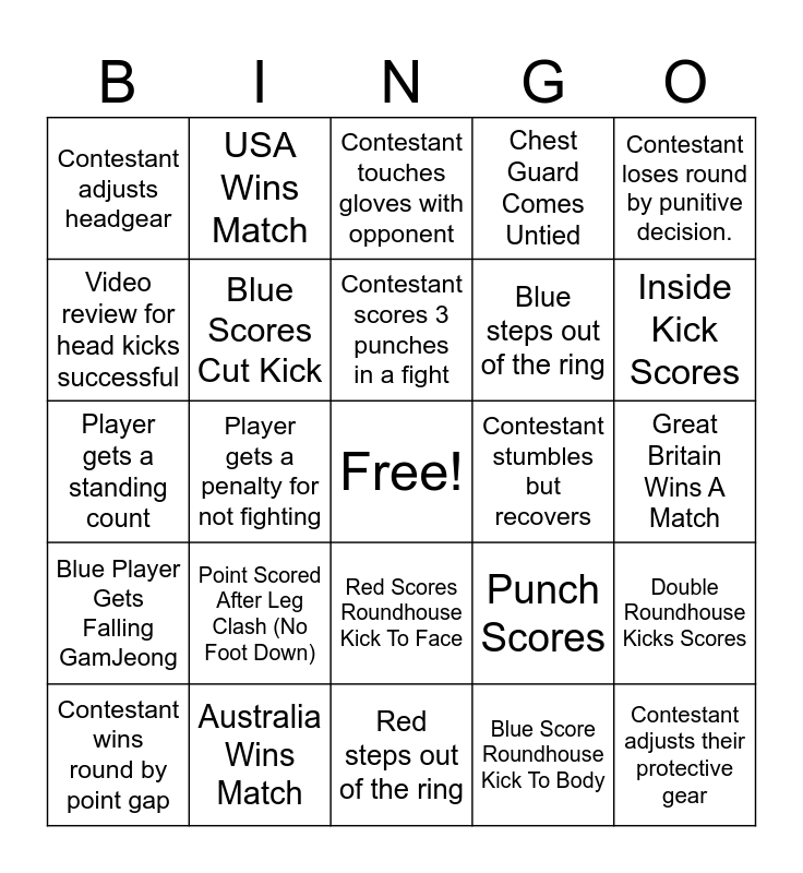 This bingo card has a free space and 58 words: Axe Kick Scores, Australia Wins Match, Belt Comes Untied, Blue Player Gets Falling GamJeong, Blue Score Roundhouse Kick To Body, Blue Score Roundhouse Kick To Face, Blue Scores Cut Kick, Blue Scores in clinch, Blue steps out of the ring, Brazil Wins Match, Chest Guard Comes Untied, China Wins Match, Coach gets a "shh" gamejeong, Coach Loses Protest Card, Coach Makes Successful Protest, Contestant adjusts headgear, Contestant adjusts their protective gear, Contestant loses round by punitive decision., Contestant Lost First Round But Wins Match, Contestant scores 3 punches in a fight, Contestant stumbles but recovers, Contestant touches gloves with opponent, Contestant wins round by point gap, Double Roundhouse Kicks Scores, GamJeong For Attacking after Kaleyo, Great Britain Wins A Match, Headkick Scores in last 5 seconds of round, Hook Kick Scores, Inside Kick Scores, Iran Wins Match, Jump Turn Round Scores, Korea Wins A Match, Match Ends Due to Knockout, Match gets delayed due to technical issues, Match gets paused for injury, Penalty for low kick, Player gets a penalty for Holding, Player gets a penalty for not fighting, Player gets a standing count, Player is told to stand up, Point Scored After Leg Clash (No Foot Down), Points Removed Because of Holding, Punch Scores, Red Player Gets Falling GamJeong, Red Scores Cut Kick, Red Scores in Clinch, Red Scores Roundhouse Kick To Body, Red Scores Roundhouse Kick To Face, Red steps out of the ring, Spin Heel Kick Scores, Tied score at end of a round, Turkey Wins Match, Turn Back Kick Scores, Turning kick scores in last 10 seconds of round, USA Wins Match, Uzbekistan Wins Match, Video review for head kicks successful and Video review for head kicks unsuccessful.