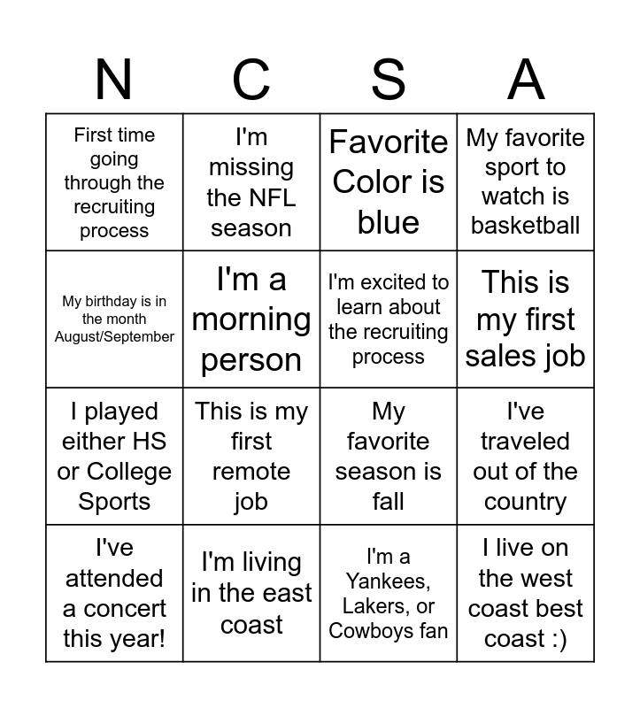 This bingo card has 16 words: I'm living in the east coast, I've traveled out of the country, Favorite Color is blue, First time going through the recruiting process, I played either HS or College Sports, I'm missing the NFL season, My favorite season is fall, I'm a Yankees, Lakers, or Cowboys fan, My birthday is in the month August/September, I'm a morning person, I've attended a concert this year!, My favorite sport to watch is basketball, This is my first remote job, This is my first sales job, I'm excited to learn about the recruiting process and I live on the west coast best coast :).