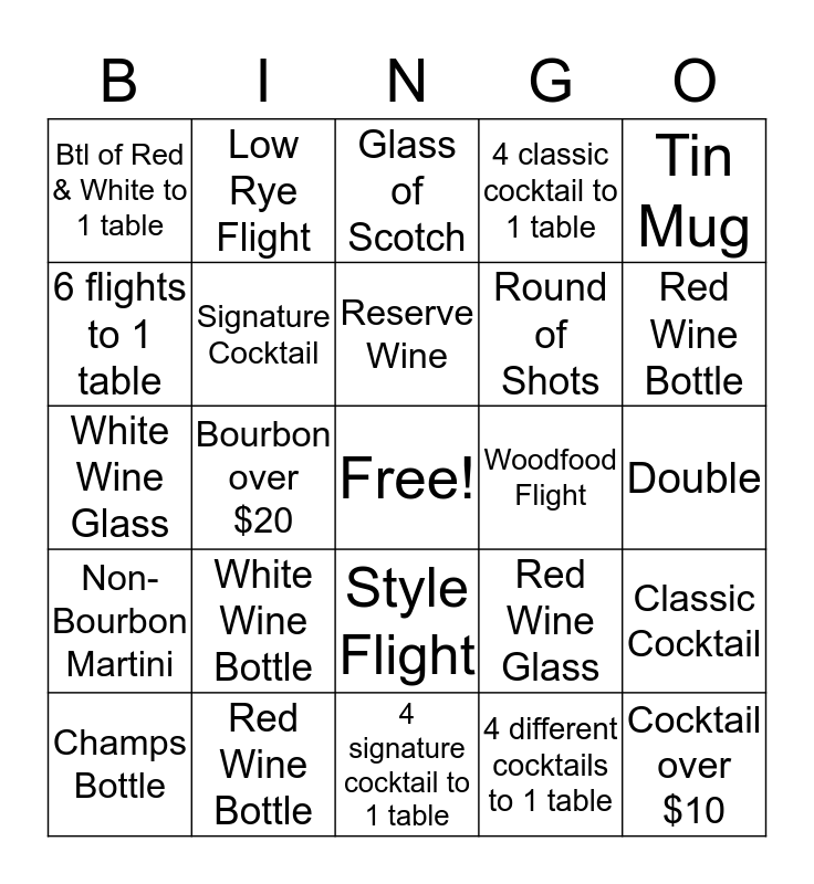 This bingo card has a free space and 24 words: White Wine Bottle, Red Wine Bottle, Reserve Wine, Champs Bottle, Tin Mug, Btl of Red & White to 1 table, 6 flights to 1 table, Low Rye Flight, Woodfood Flight, Style Flight, Round of Shots, White Wine Glass, Red Wine Glass, Classic Cocktail, Signature Cocktail, 4 different cocktails to 1 table, Double, Glass of Scotch, Red Wine Bottle, Bourbon over $20, Cocktail over $10, Non-Bourbon Martini, 4 classic cocktail to 1 table and 4 signature cocktail to 1 table.