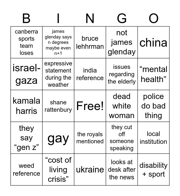 This bingo card has a free space and 46 words: olympics, disability + sport, rachael puppazoni, ukraine, gay, “fighting for their life”, james glenday says n degrees maybe even n+1, david pocock/ bald white guy that looks similar, israel-gaza, bitcoin, expressive statement during the weather, not james glenday, local institution, they cut off someone speaking, “back home”, trump, india reference, dead white woman, it is forecasted to rain tomorrow, china, shane rattenbury, looks at desk after the news, canberra sports team loses, issues regarding the elderly, albo makes an appearance, “mental health”, weed reference, elizabeth lee, the royals mentioned, they say “gen z”, james glenday asks for weather pics, hot weather, women’s sport before men’s, ANU mentioned, We see a place that we’ve been to, “cost of living crisis”, police do bad thing, the presenter slips up, a trigger warning, zoom interview, they try to warn you about an illness, bruce lehhrman, kamala harris, rhyming couplet, they say the n in government and gold medal.