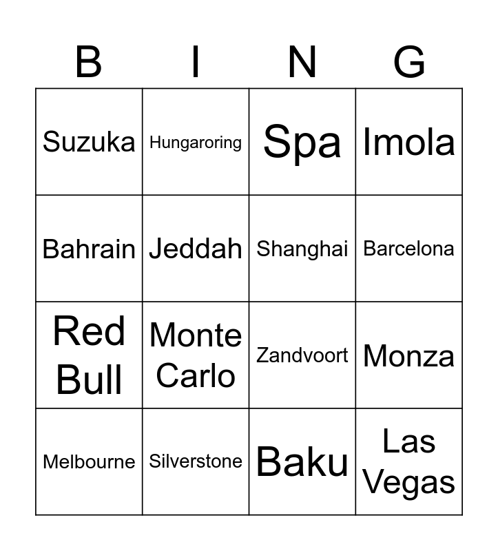 This bingo card has 16 words: Silverstone, Monza, Spa, Suzuka, Red Bull, Hungaroring, Zandvoort, Baku, Bahrain, Jeddah, Melbourne, Imola, Monte Carlo, Barcelona, Shanghai and Las Vegas.