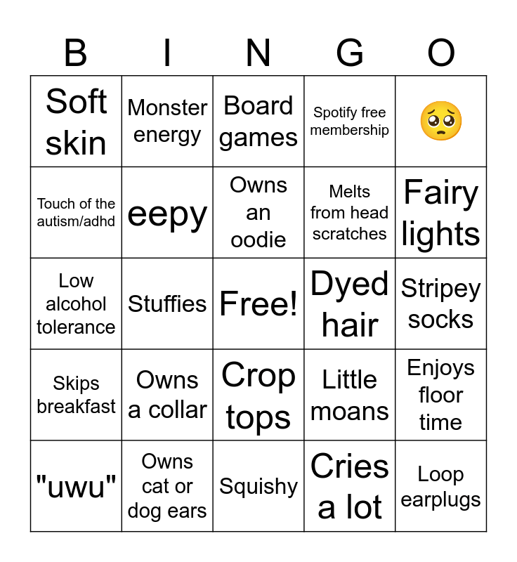 This bingo card has a free space and 24 words: Owns a collar, Owns cat or dog ears, Owns an oodie, "uwu", 🥺, Soft skin, Touch of the autism/adhd, Monster energy, Dyed hair, Crop tops, Melts from head scratches, Low alcohol tolerance, Little moans, Enjoys floor time, eepy, Cries a lot, Stripey socks, Board games, Fairy lights, Stuffies, Loop earplugs, Skips breakfast, Spotify free membership and Squishy.