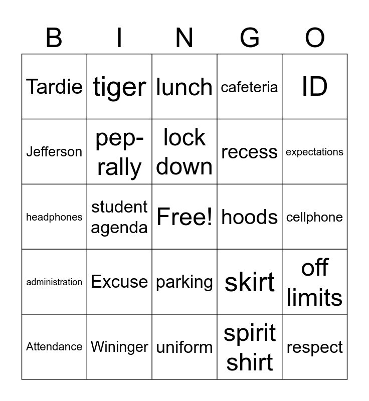 This bingo card has a free space and 29 words: Attendance, Starr, student agenda, Price, Tardie, lunch, pep-rally, Excuse, hoods, Wininger, cellphone, respect, uniform, spirit shirt, expectations, awake, parking, administration, ID, headphones, skirt, restroom, recess, Jefferson, cafeteria, tiger, off limits, lock down and Ezell.