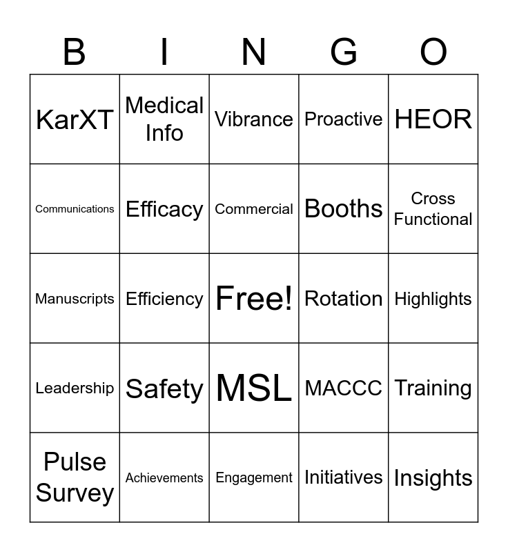 This bingo card has a free space and 29 words: Pulse Survey, Action Plan, Efficiency, Plans, KarXT, Vibrance, Efficacy, Safety, Rotation, Achievements, Highlights, Insights, Engagement, Initiatives, Cross Functional, HCP, MSL, Leadership, HEOR, Manuscripts, MACCC, Advisory Board, Booths, Communications, Proactive, Medical Info, Training, Commercial and A308.