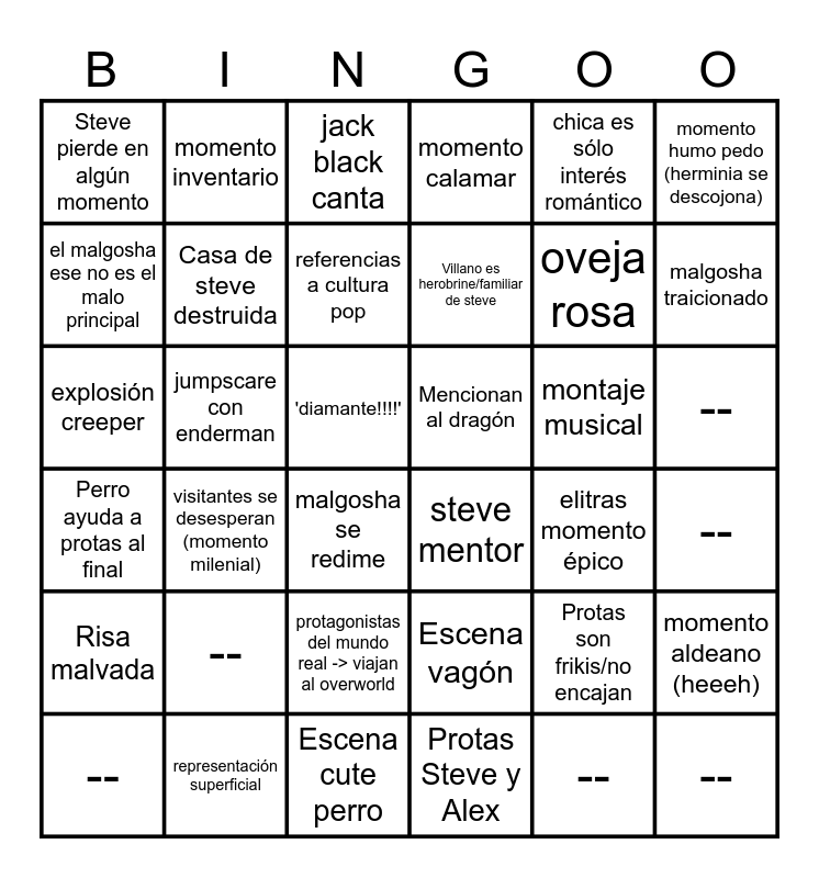This bingo card has 36 words: Escena vagón, protagonistas del mundo real -> viajan al overworld, Protas Steve y Alex, el malgosha ese no es el malo principal, Perro ayuda a protas al final, Mencionan al dragón, Casa de steve destruida, Escena cute perro, chica es sólo interés romántico, Protas son frikis/no encajan, malgosha traicionado, momento calamar, momento aldeano (heeeh), jumpscare con enderman, Villano es herobrine/familiar de steve, Steve pierde en algún momento, Risa malvada, montaje musical, explosión creeper, jack black canta, 'diamante!!!!', visitantes se desesperan (momento milenial), steve mentor, malgosha se redime, elitras momento épico, momento inventario, oveja rosa, representación superficial, referencias a cultura pop, momento humo pedo (herminia se descojona), --, --, --, --, -- and --.