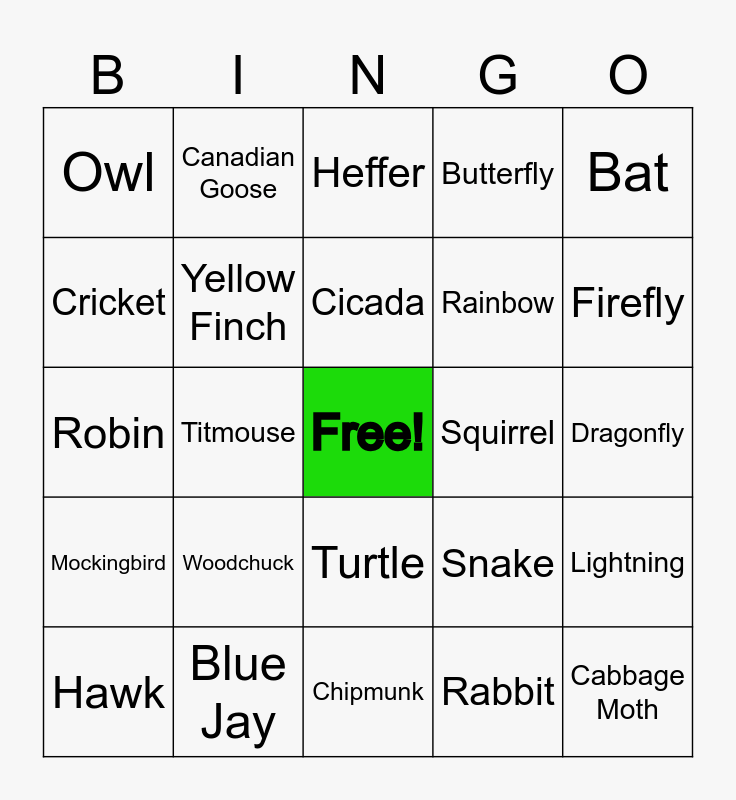 This bingo card has a free space and 34 words: Turkey, Rabbit, Deer, Vulture, Mockingbird, Yellow Finch, Bat, Hawk, Canadian Goose, Humming Bird, Cicada, Heffer, Cardinal, Blue Bird, Squirrel, Firefly, Blue Jay, Robin, Woodchuck, Snake, Turtle, Fox, Owl, Dragonfly, Chipmunk, Cabbage Moth, Butterfly, Meteor, Rainbow, Cricket, Chickadee, Titmouse, Lightning and Junebug.