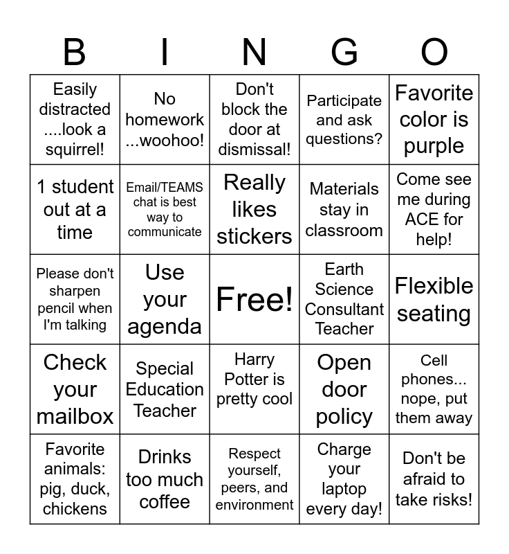 This bingo card has a free space and 24 words: Special Education Teacher, Drinks too much coffee, Really likes stickers, Favorite animals: pig, duck, chickens, Favorite color is purple, Easily distracted ....look a squirrel!, 1 student out at a time, No homework ...woohoo!, Earth Science Consultant Teacher, Harry Potter is pretty cool, Materials stay in classroom, Please don't sharpen pencil when I'm talking, Open door policy, Cell phones... nope, put them away, Email/TEAMS chat is best way to communicate, Charge your laptop every day!, Flexible seating, Don't block the door at dismissal!, Come see me during ACE for help!, Use your agenda, Don't be afraid to take risks!, Check your mailbox, Participate and ask questions? and Respect yourself, peers, and environment.