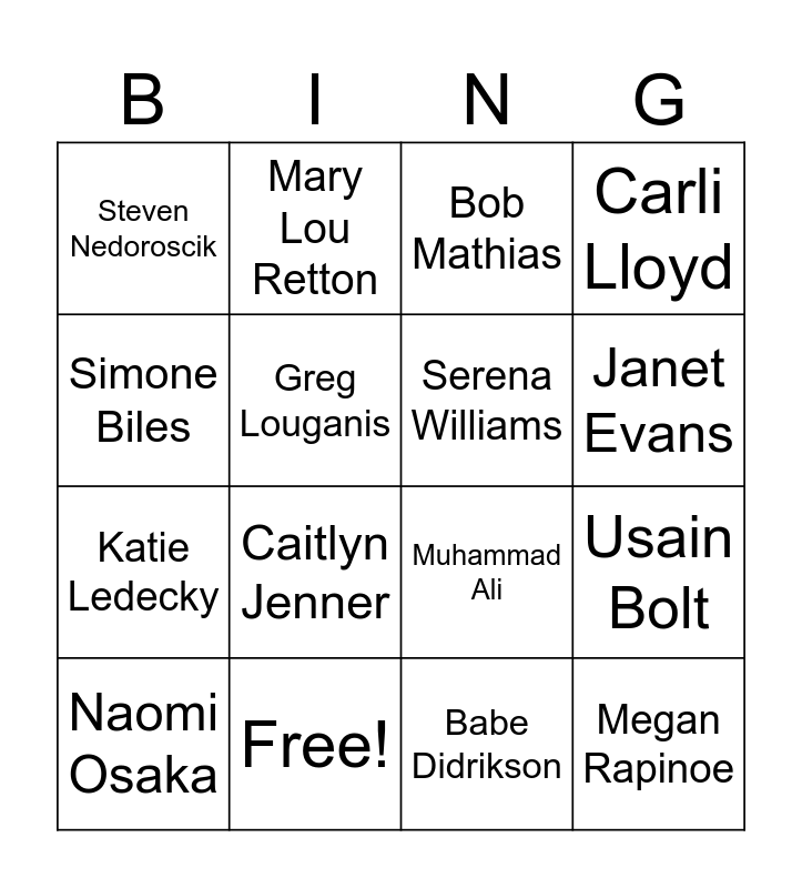 This bingo card has 25 words: Michael Phelps, Ryan Lochte, Janet Evans, Carl Lewis, Simone Biles, Steven Nedoroscik, Greg Louganis, Mary Lou Retton, Free!, Suni Lee, Katie Ledecky, Muhammad Ali, Florence Griffith Joyner, Simone Biles, Serena Williams, Michael Jordan, Babe Didrikson, Bob Mathias, Caitlyn Jenner, Usain Bolt, Naomi Osaka, Hannah Roberts, Megan Rapinoe, Carli Lloyd and Nadia Comaneci.
