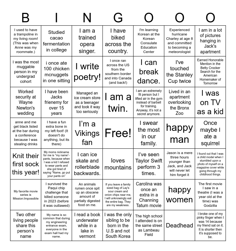 This bingo card has a free space and 88 words: I once auditioned for American Idol, I read a book underwater while in a lake in vermont, I am a twin., I once got a world record in a videogame while on the toilet, I have both a tiktok and a tweet that has gone viral, I used to Irish dance when I was younger., The first movie I saw in a theatre (I was a year old at the time) was Godzilla, happy man, happy women, I once transported a live freshwater wolf fish internationally and somehow took it through US customs without declaring it, I've caught a shark while fishing, I have moved across the country before using only a backpack and carry-on suitcase., Lived in an apartment overlooking the Bronx Zoo, Worked security at Wayne Newton's wedding, Took a yacht ride along Italy's Amalfi coast, I was the most muggable person in my undergrad cohort, I swear the most in our family., I’ve seen Taylor Swift perform 3 times., I’ve caught 20 bass in a couple of hours., My favorite movie series is Mission:Impossible, If you leave a family sized bag of Lay's sour cream and onion chips near me, I will unknowingly eat the entire bag. They are my weakness., I found out that I was a child model when I stumbled upon a photo of myself on a magazine cover while going through my childhood things., I once ran across the US from the southern border and into Canada (and back!), I am left handed, I’m a Vikings fan, I have bendy body syndrome!, I once won a mole day costume contest by skateboarding on my stomach, A professor once bought me an extremely expensive apple so that I could ASMR the class with its crunchiness, Took ballet classes for 22 years, Have seen the northern lights in 2 different continents, I am a trained opera singer., I have biked across the country., I survived the Paqui chip challenge that killed someone in 2023 (before it was outlawed), Knit their first sock this year!, Managed an ice cream store as a teenager and took it way too seriously, Experienced hurricane Charley at age 8 and committed to becoming a meteorologist, I used to have a trampoline in my living room! (This was when Anne was my roommate.), When I was a Girl Scout troop leader in college, the girls and I planned a pancake eating contest!, I can ice skate and rollerblade backwards., I write poetry!, I can break dance., Jason is a mere three hours younger than Jack, and Jack will never let him forget it, Carolina was once an extra in a Channing Tatum movie, I am an extremely fit person but I lifted air in the gym instead of barbell for training. Anyway, it’s not a secret anymore., Earned Honorable Mention in the Betty Crocker Search for the American Homemaker of Tomorrow, Two other living people share this person’s name, I was once worked at a bakery and in one shift burnt close to 100 cookies. The bakery closed shortly after., An animals rumen once spit up an obscene amount of partially digested food on me., I use an otoscope at work every day, i once ate 100 chicken mcnuggets in one sitting, i always leave my phone half-off the table :P, loves mountains, Deadhead, For a class in my Australian highschool I was part of a youth circus group., I am friends with a member of the Royal family., My family has been collecting coffee mugs from around the world for 4 generations, I have been Jacks frienemy for over 15 years, Studied cacao fermentation in college, I sometimes sing "Que sera sera" when I am really drunk..., I stole the European Parliament sign, my name is made up of first letters in the names of my family members, Tenderness of my cheeks is unparalleled, My elbows hyperextend to like 195 degrees, My pet food bill is more than my grocery bill., NA, anne and me get black listed at the bar during a conference because I was stealing drinks, Being a chicken when it comes to public speaking., I am in a lot of pictures hanging in Jack's apartment, I was on TV as a kid, I've touched the Stanley Cup twice, I broke one of my pinky finger when I was 14 because my friend sat on it. It is shorter then it’s supposed to be., My name is so common that during my engineering entrance exam, everyone in the exam hall had my name., I was the only sibling to be born in the U.S and not South Korea, I'm learning Korean at the Korean Consulate Education Center, I am Latvian, Ran a marathon and qualified for Boston, The high school I attended is on the same street as Lambeau Field, Sank his boat while it was actually tied up at the dock, I have a fun extra bone in my left foot! (It doesn't do anything, but its there), My moms nickname for me is “my name”-pants, because when I was a kid I refused to wear pants and she got tired of saying “Name, go put your pants on”, I foster dogs., Built my own airplane., I’ve lived in all the four corner states!, I took AR tests for other kids in elementary school!, I've completed one Ironman triathlon, hmmm that I won the California state free throw championship lol, Once maybe I ate a squirrel and Twice maybe I ate a squirrel.