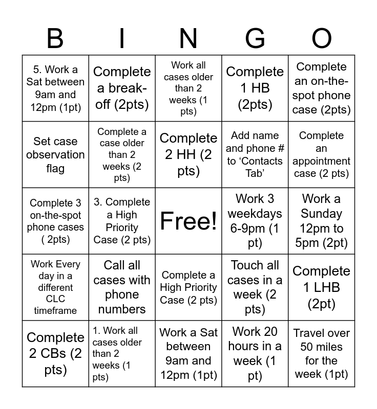 This bingo card has a free space and 30 words: 1. Work all cases older than 2 weeks (1 pts), 2. Complete a case older than 2 weeks (2 pts), 3. Complete a High Priority Case (2 pts), 4. Work 3 weekdays 6-9pm (1 pt), 5. Work a Sat between 9am and 12pm (1pt), Work all cases older than 2 weeks (1 pts), Complete a case older than 2 weeks (2 pts), Complete a High Priority Case (2 pts), Work 3 weekdays 6-9pm (1 pt), Work a Sat between 9am and 12pm (1pt), Work a Sunday 12pm to 5pm (2pt), Travel over 50 miles for the week (1pt), Work 20 hours in a week (1 pt), Work 25 or more hours in a week (2pt), Complete an appointment case (2 pts), Get 5 appointments (1 pts), Touch all cases in a week (2 pts), Work Every day in a different CLC timeframe, Call all cases with phone numbers, Complete an on-the-spot phone case (2pts), Complete 3 on-the-spot phone cases ( 2pts), Complete a refusal (2pts), Complete a break-off (2pts), Add name and phone # to ‘Contacts Tab’, Set case observation flag, Complete 1 HB (2pts), Complete 1 LHB (2pt), Complete 2 CBs (2 pts), Complete 2 HH (2 pts) and Complete 2 WF (2pts).