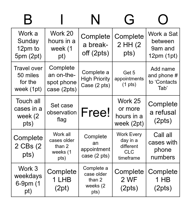 This bingo card has a free space and 25 words: Work all cases older than 2 weeks (1 pts), Complete a case older than 2 weeks (2 pts), Complete a High Priority Case (2 pts), Work 3 weekdays 6-9pm (1 pt), Work a Sat between 9am and 12pm (1pt), Work a Sunday 12pm to 5pm (2pt), Travel over 50 miles for the week (1pt), Work 20 hours in a week (1 pt), Work 25 or more hours in a week (2pt), Complete an appointment case (2 pts), Get 5 appointments (1 pts), Touch all cases in a week (2 pts), Work Every day in a different CLC timeframe, Call all cases with phone numbers, Complete an on-the-spot phone case (2pts), Complete 3 on-the-spot phone cases ( 2pts), Complete a refusal (2pts), Complete a break-off (2pts), Add name and phone # to ‘Contacts Tab’, Set case observation flag, Complete 1 HB (2pts), Complete 1 LHB (2pt), Complete 2 CBs (2 pts), Complete 2 HH (2 pts) and Complete 2 WF (2pts).