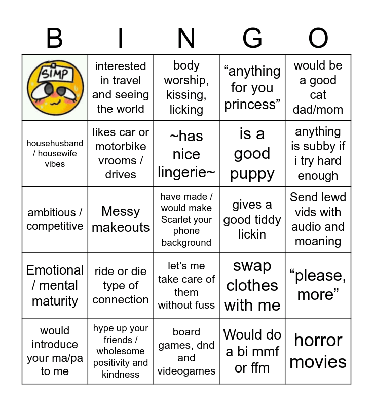 This bingo card has 1 images, a free space and 23 words: ride or die type of connection, hype up your friends / wholesome positivity and kindness, ~has nice lingerie~, would introduce your ma/pa to me, would be a good cat dad/mom, househusband / housewife vibes, interested in travel and seeing the world, gives a good tiddy lickin, let’s me take care of them without fuss, is a good puppy, ambitious / competitive, swap clothes with me, “please, more”, likes car or motorbike vrooms / drives, Would do a bi mmf or ffm, Send lewd vids with audio and moaning, body worship, kissing, licking, anything is subby if i try hard enough, Messy makeouts, horror movies, Emotional / mental maturity, “anything for you princess” and board games, dnd and videogames.