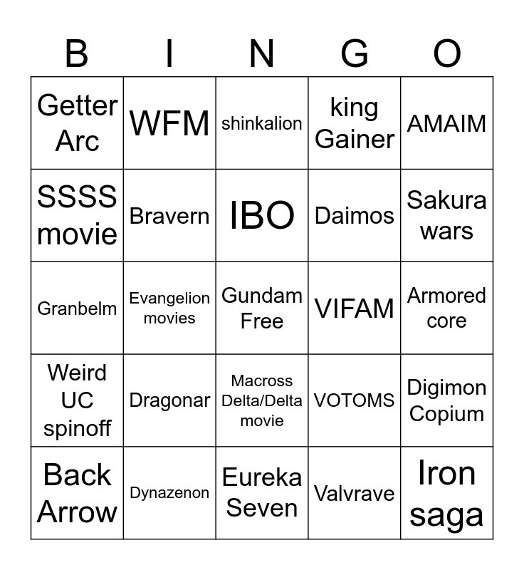 This bingo card has a free space and 24 words: Dragonar, Dynazenon, IBO, Back Arrow, AMAIM, Getter Arc, SSSS movie, WFM, VIFAM, Macross Delta/Delta movie, Daimos, Granbelm, VOTOMS, Digimon Copium, Bravern, Valvrave, Armored core, shinkalion, Sakura wars, Evangelion movies, Iron saga, Weird UC spinoff, king Gainer and Eureka Seven.