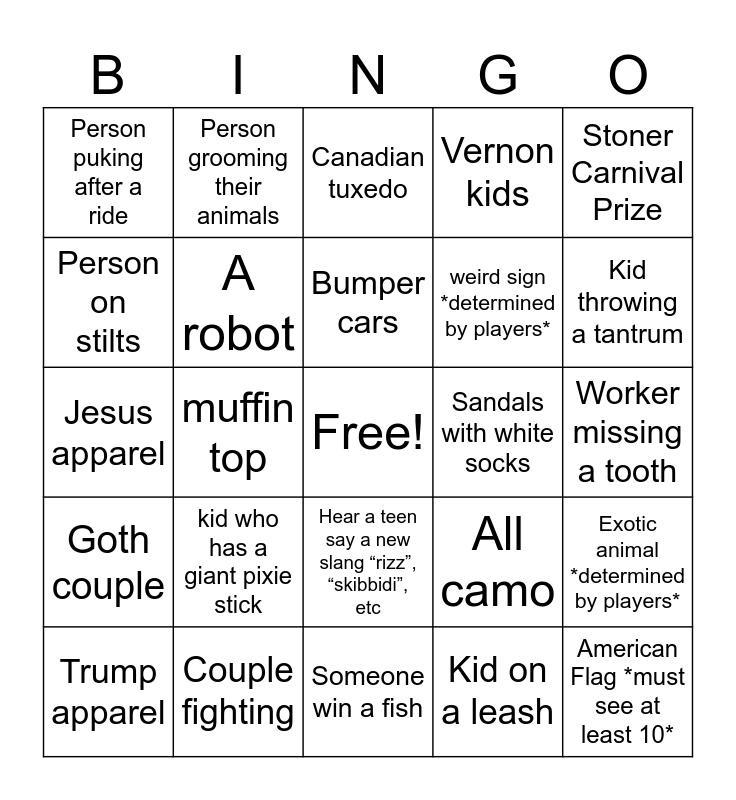 This bingo card has a free space and 24 words: kid who has a giant pixie stick, Couple fighting, Bumper cars, Trump apparel, Stoner Carnival Prize, Person puking after a ride, Person on stilts, Person grooming their animals, Sandals with white socks, Hear a teen say a new slang “rizz”, “skibbidi”, etc, weird sign *determined by players*, Jesus apparel, All camo, Exotic animal *determined by players*, A robot, Kid on a leash, Worker missing a tooth, Canadian tuxedo, Kid throwing a tantrum, muffin top, American Flag *must see at least 10*, Goth couple, Vernon kids and Someone win a fish.