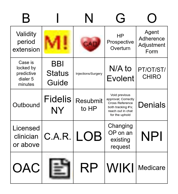 This bingo card has 10 images, a free space and 29 words: YES, NO, Appeals Team, BBI Status Guide, OAC, LOB, Injections/Surgery, Genetic Testing, Agent Adherence Adjustment Form, Licensed clinician or above, Fidelis NY, HP Prospective Overturn, Medicare, Denials, Void previous approval; Correctly Cross Reference both tracking #’s; reach out in chat for the uphold, C.A.R., Verify all information, search by name and D.O.B & Member ID, then Add member, Validity period extension, BBI System Issues, Changing OP on an existing request, Case is locked by predictive dialer 5 minutes, RP, N/A to Evolent, PT/OT/ST/ CHIRO, WIKI, TIN, NPI, Outbound and Inbound.