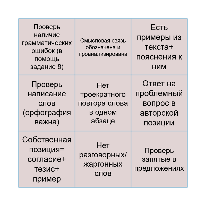 This bingo card has a free space and 8 words: Ответ на проблемный вопрос в авторской позиции, Есть примеры из текста+ пояснения к ним, Смысловая связь обозначена и проанализирована, Собственная позиция= согласие+ тезис+ пример, Проверь наличие грамматических ошибок (в помощь задание 8), Проверь запятые в предложениях, Проверь написание слов (орфография важна) and Нет разговорных/ жаргонных слов.