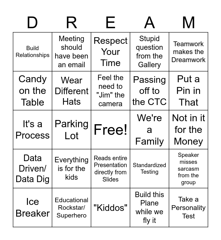 This bingo card has a free space and 29 words: Ice Breaker, Remember your why, Parking Lot, Circle Back, Build Relationships, Respect Your Time, Wear Different Hats, Everything is for the kids, We're a Family, Educational Rockstar/ Superhero, Not in it for the Money, Take a Personality Test, "Kiddos", Build this Plane while we fly it, Put a Pin in That, Worthless Handout Provided, Reads entire Presentation directly from Slides, Data Driven/ Data Dig, Teamwork makes the Dreamwork, It's a Process, Standardized Testing, Calling Meetings Fun, Passing off to the CTC, Candy on the Table, Stupid question from the Gallery, Meeting should have been an email, Speaker misses sarcasm from the group, Feel the need to "Jim" the camera and Take this back to the classroom.