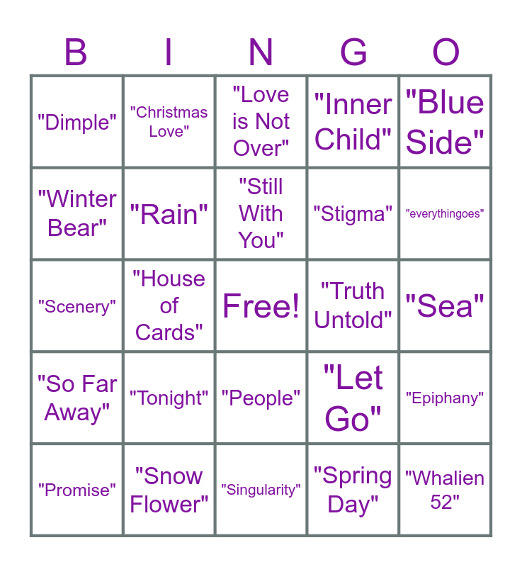 This bingo card has a free space and 31 words: "Singularity", "Lie", "House of Cards", "Love Maze", "Dimple", "Love is Not Over", "Rain", "Let Go", "Truth Untold", "Spring Day", "Sea", "Whalien 52", "Butterfly", "seoul", "everythingoes", "tokyo", "Epiphany", "Tonight", "So Far Away", "People", "Blue Side", "Daydream", "Promise", "Christmas Love", "Stigma", "Winter Bear", "Inner Child", "Scenery", "Snow Flower", "Still With You" and "My Time".