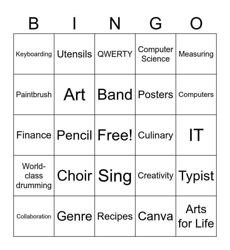 This bingo card has a free space and 36 words: Sewing, Ingredients, FACS, Art, Creativity, World-class drumming, Band, Color wheel, Measuring, Chromebook, Pencil, Computer Science, Illusion, Culinary, Computers, Keyboarding, Cooking, Choir, Arts for Life, QWERTY, IT, Typist, Genre, Collaboration, Recipes, Utensils, Finance, Complementary colors, Posters, Paintbrush, Instrument, Coding, Canva, Sing, Play and Learn.