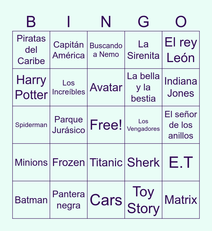 This bingo card has a free space and 24 words: Frozen, Pantera negra, Avatar, Batman, El rey León, Piratas del Caribe, Harry Potter, Capitán América, Los Vengadores, Titanic, La bella y la bestia, Spiderman, Sherk, E.T, Los Increíbles, Toy Story, El señor de los anillos, Buscando a Nemo, Indiana Jones, Parque Jurásico, Matrix, Minions, La Sirenita and Cars.