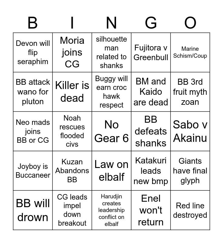 This bingo card has a free space and 24 words: Kuzan Abandons BB, CG leads impel down breakout, Buggy will earn croc hawk respect, BB will drown, Marine Schism/Coup, Devon will flip seraphim, BB attack wano for pluton, Moria joins CG, BB defeats shanks, Law on elbalf, BM and Kaido are dead, Neo mads joins BB or CG, Katakuri leads new bmp, Giants have final glyph, Killer is dead, Enel won't return, Sabo v Akainu, silhouette man related to shanks, BB 3rd fruit myth zoan, Noah rescues flooded civs, Red line destroyed, Joyboy is Buccaneer, Fujitora v Greenbull and Harudjin creates leadership conflict on elbalf.