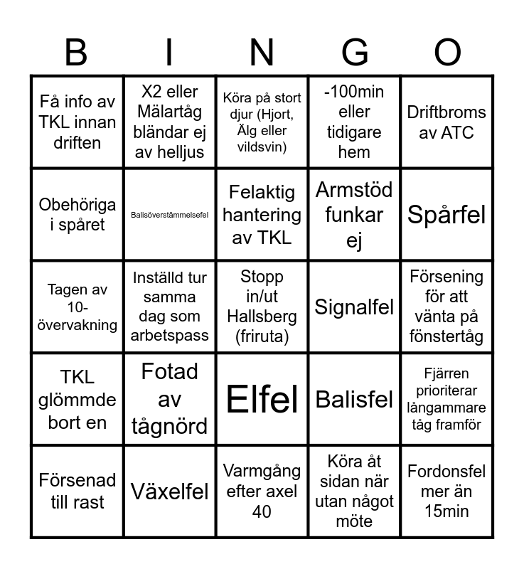 This bingo card has a free space and 24 words: Fotad av tågnörd, Växelfel, Felaktig hantering av TKL, Försenad till rast, Driftbroms av ATC, Få info av TKL innan driften, Obehöriga i spåret, X2 eller Mälartåg bländar ej av helljus, Signalfel, Elfel, Armstöd funkar ej, Tagen av 10- övervakning, Balisfel, Fjärren prioriterar långammare tåg framför, Balisöverstämmelsefel, Köra åt sidan när utan något möte, Försening för att vänta på fönstertåg, Köra på stort djur (Hjort, Älg eller vildsvin), Spårfel, Inställd tur samma dag som arbetspass, Fordonsfel mer än 15min, TKL glömmde bort en, -100min eller tidigare hem and Varmgång efter axel 40.